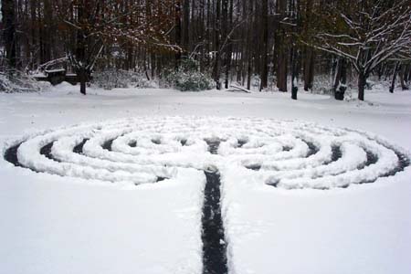 A labyrinth is a maze-like path designed to facilitate meditation and prayer. It can be formed three dimensionally with walls or shrubbery or by a pattern made on the floor or ground. There is one path into the center of a labyrinth and one path out of it. A maze is designed as a puzzle but a labyrinth is not intended to be difficult to navigate. Its singular path is merely a way to physically engage in prayer and worship experientally.